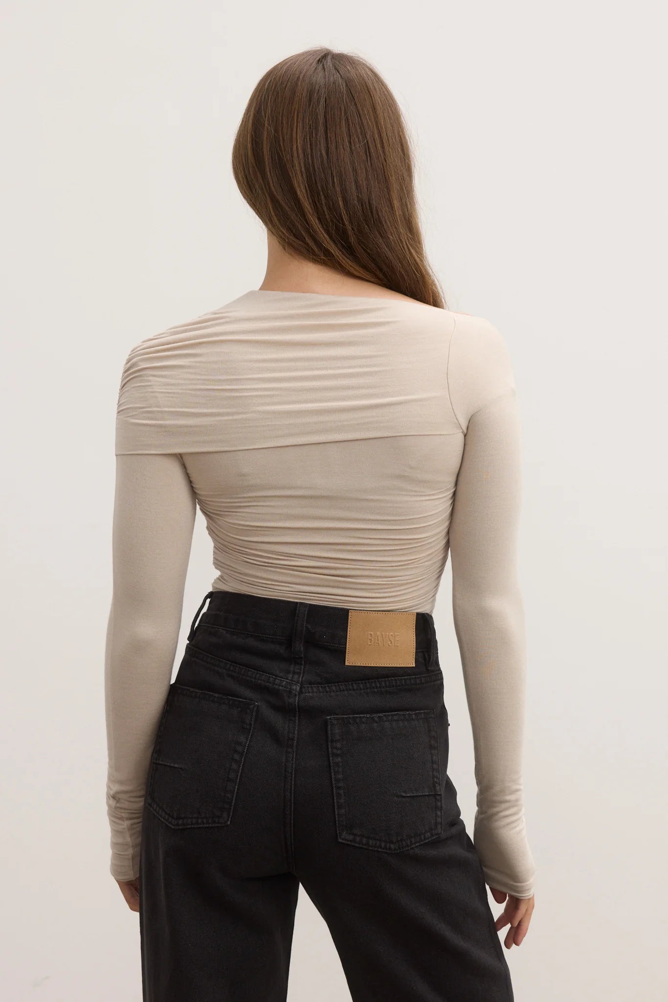Introducing our Yani Top — crafted from our much-loved soft jersey, featuring a sharp front cut-out and strong ruching across the bust and over the shoulder. A statement silhouette with an elevated edge.
