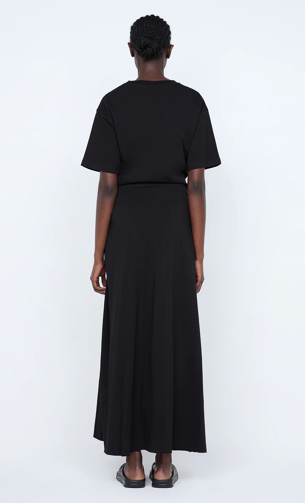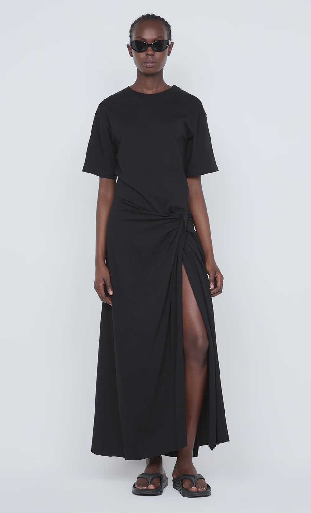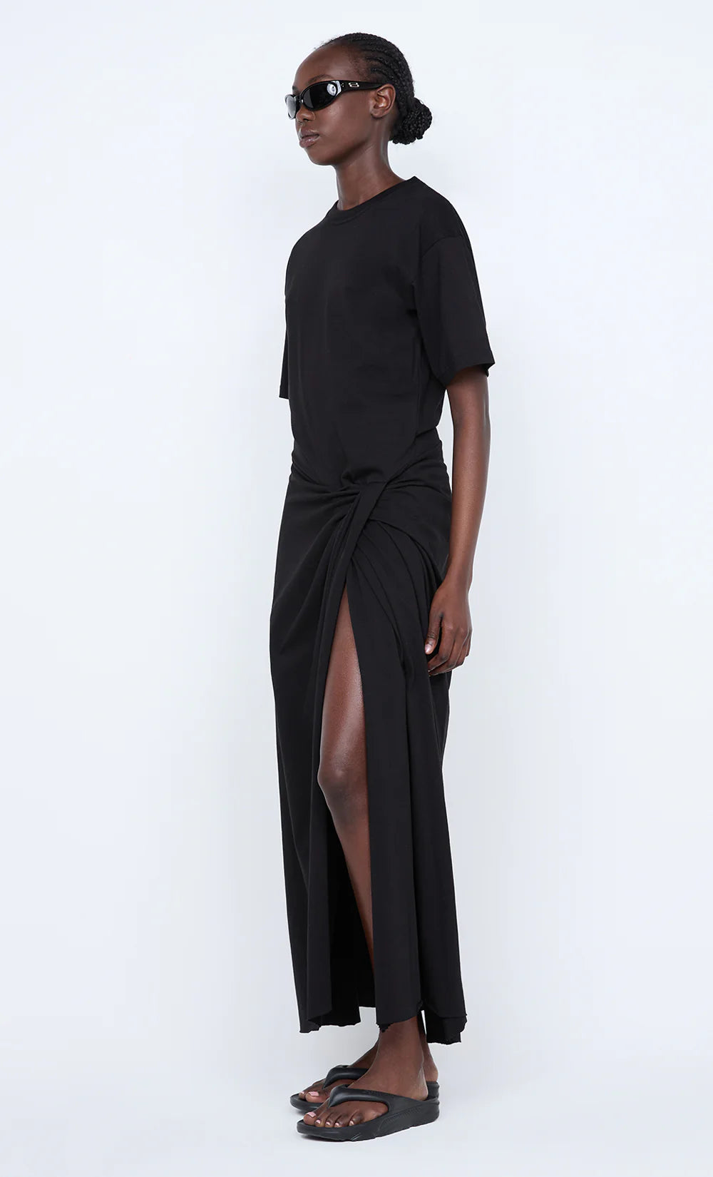 Cyprus Twist Tee Dress in Black. This effortless black tee dress, with its relaxed boxy fit and a unique twist detail at the waist, is perfect for effortless styling.