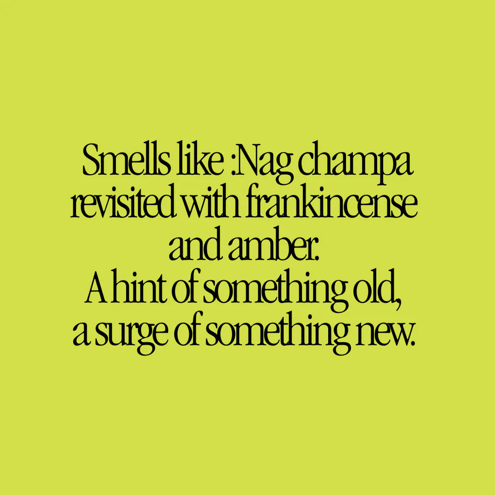 Smells like: Nag champa revisited with frankincense and amber. A hint of something old, a surge of something new.