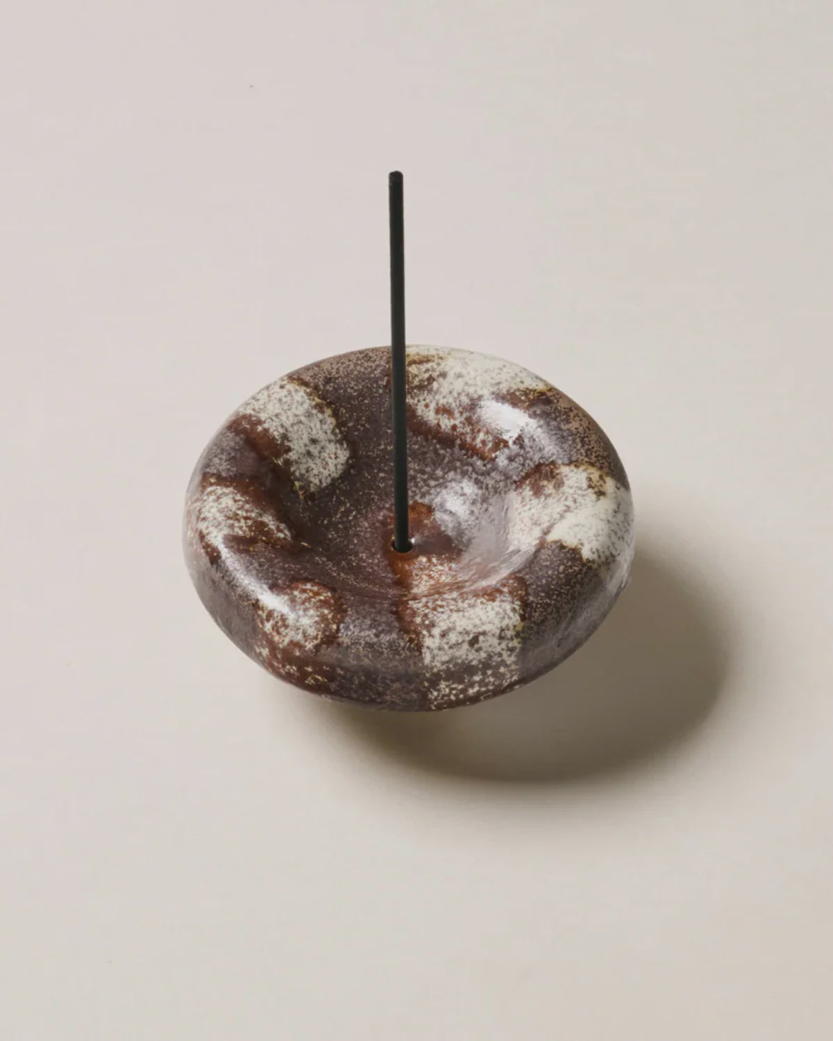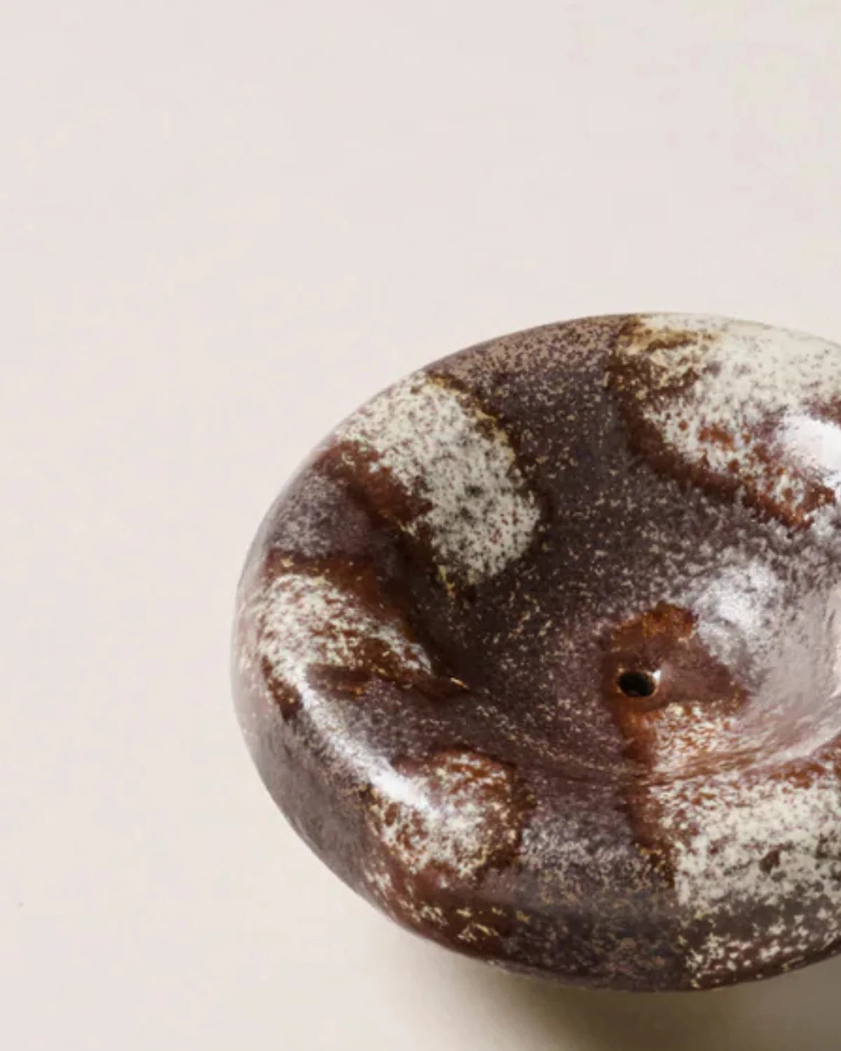 Finished in a unique chocolate and cream stripe glaze, it pairs beautifully with any interior style, from modern minimal to earthy organic. The central opening holds standard incense sticks upright, allowing ash to catch neatly into its wide basin.