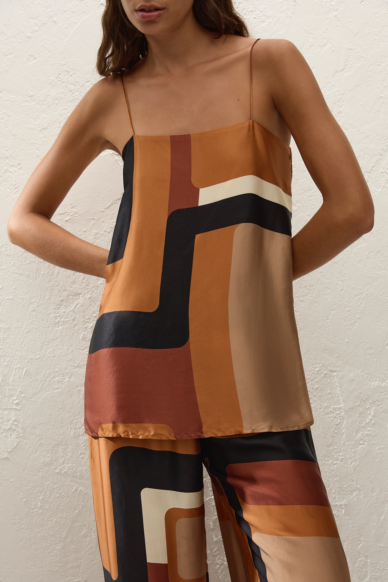 A 90s-inspired slip-style top, designed from a luxurious viscose satin fabrication, in a unique geometric print. Hanging effortlessly off the body in a straight silhouette, it features a straight neckline and thin adjustable straps as well as side seam splits. The hem is finished with a navy blue band. Style over the matching Jensen Pant for an elevated approach to everyday dressing.