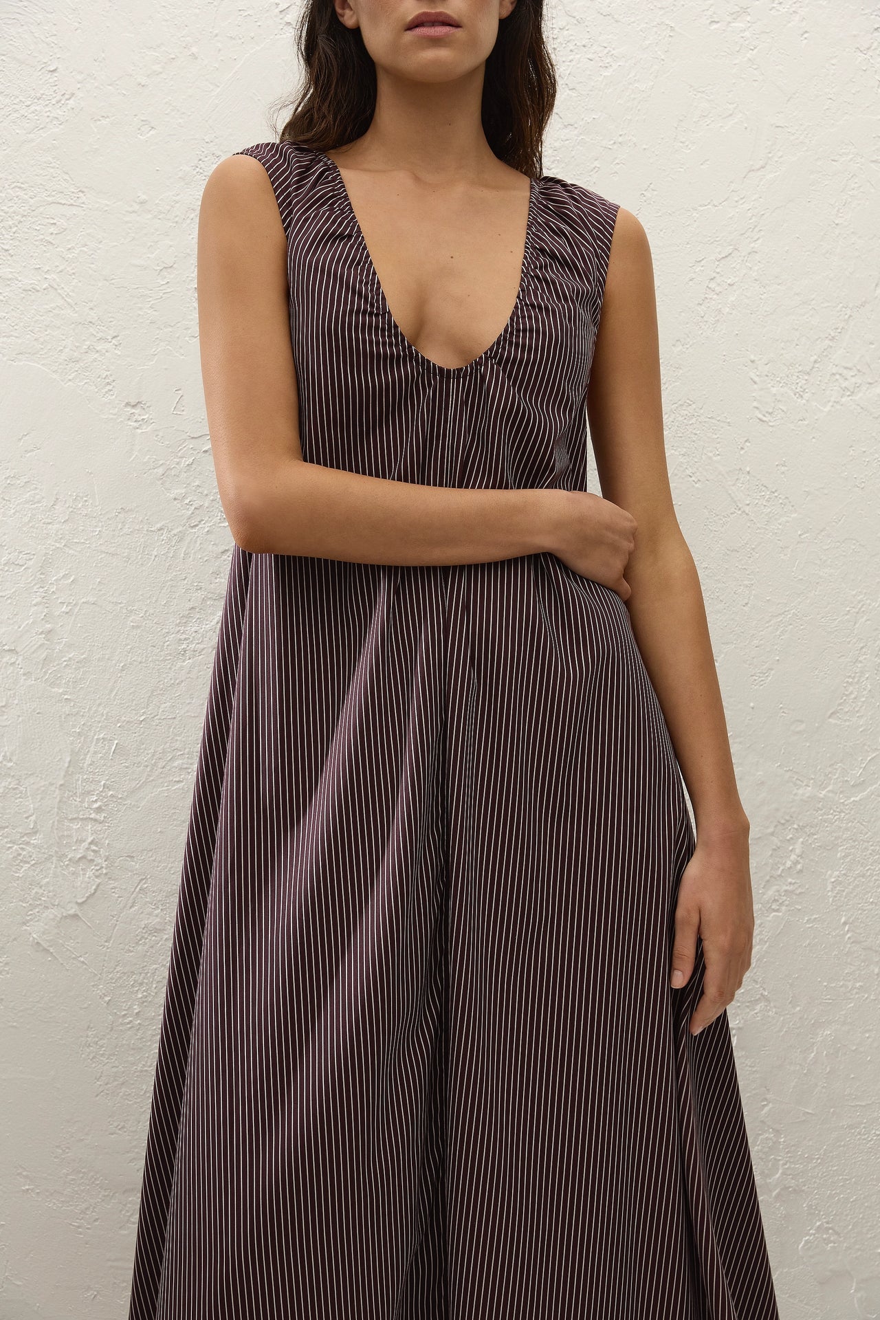 An effortless inspired maxi dress, designed from a signature 100% BCI Certified organic cotton in a chocolate and plum pinstripe. With a scoop neckline, it is a relaxed silhouette that flares into an A-line silhouette with side seam pockets. There is also a scoop back with a simple tie detail as well as subtle gathering. Style with a simple sandal for summer occasionwear.