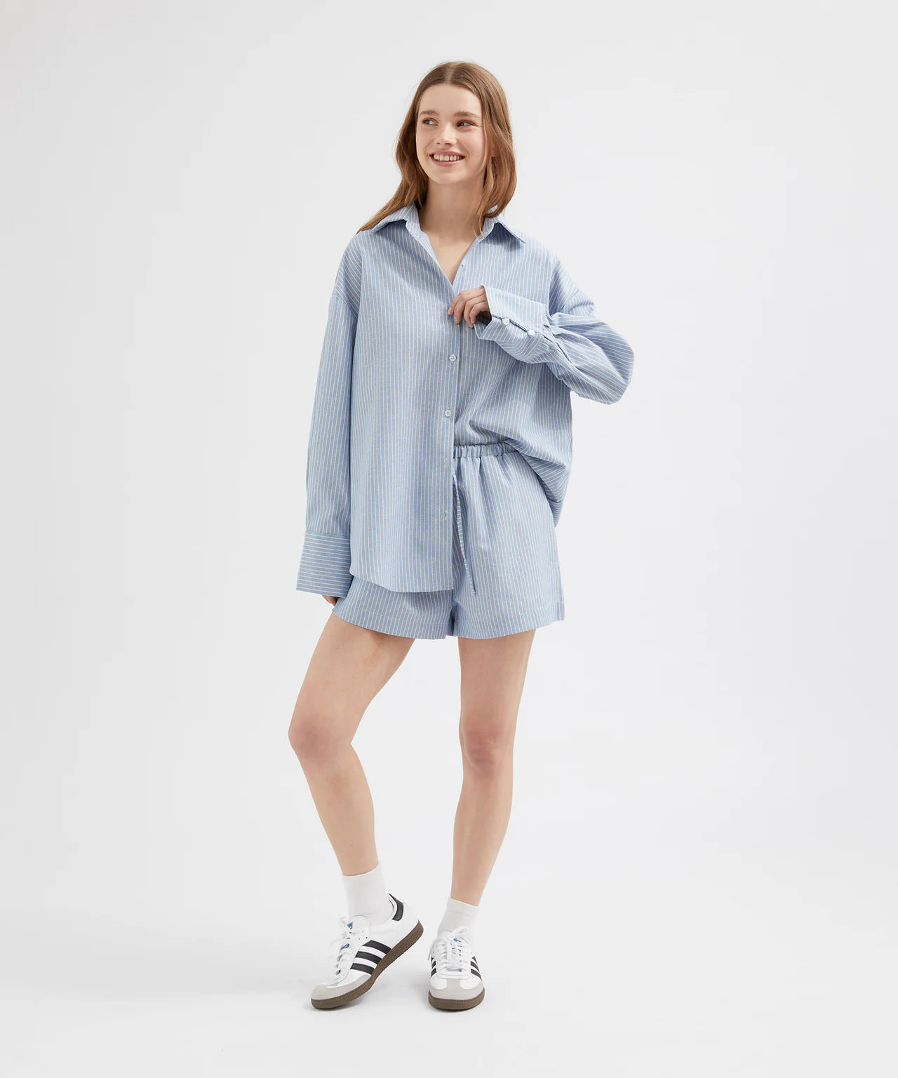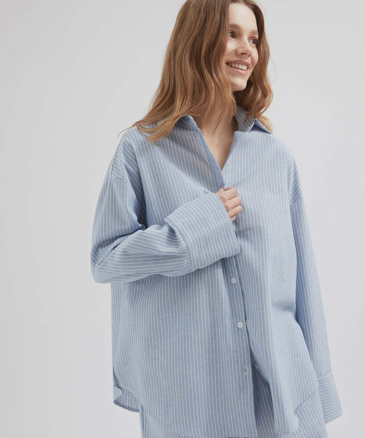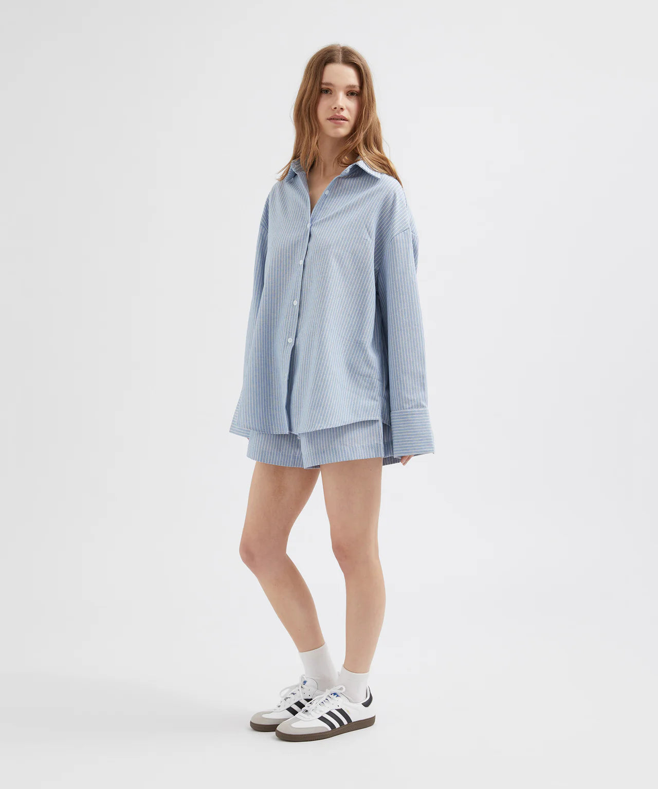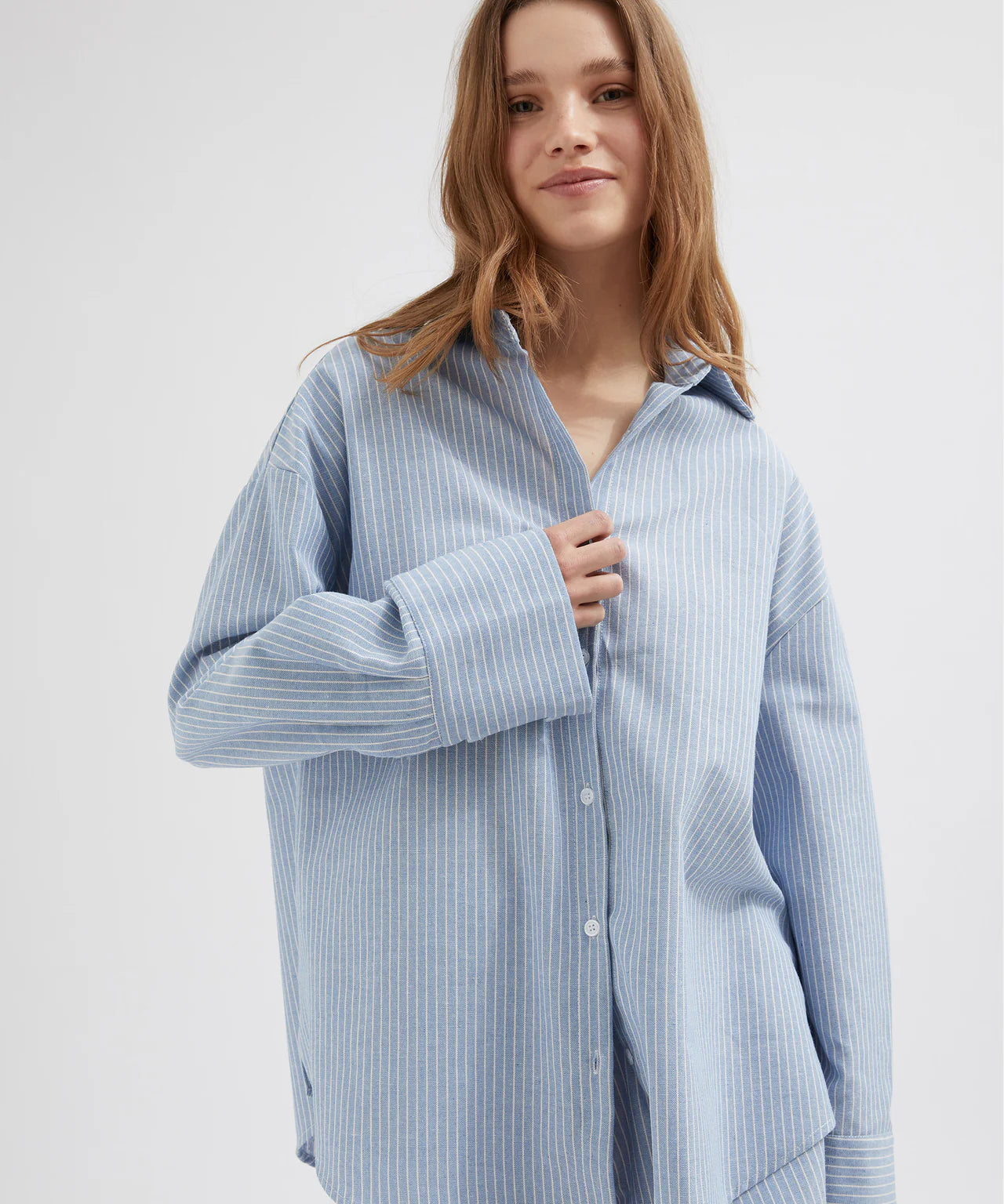 Effortlessly cool and versatile. Featured in a stripe print, this shirt features a curved hemline and relaxed silhouette. The wide cuff is detailed with self fabric loops and buttons. Composed of soft cotton-linen blend.
