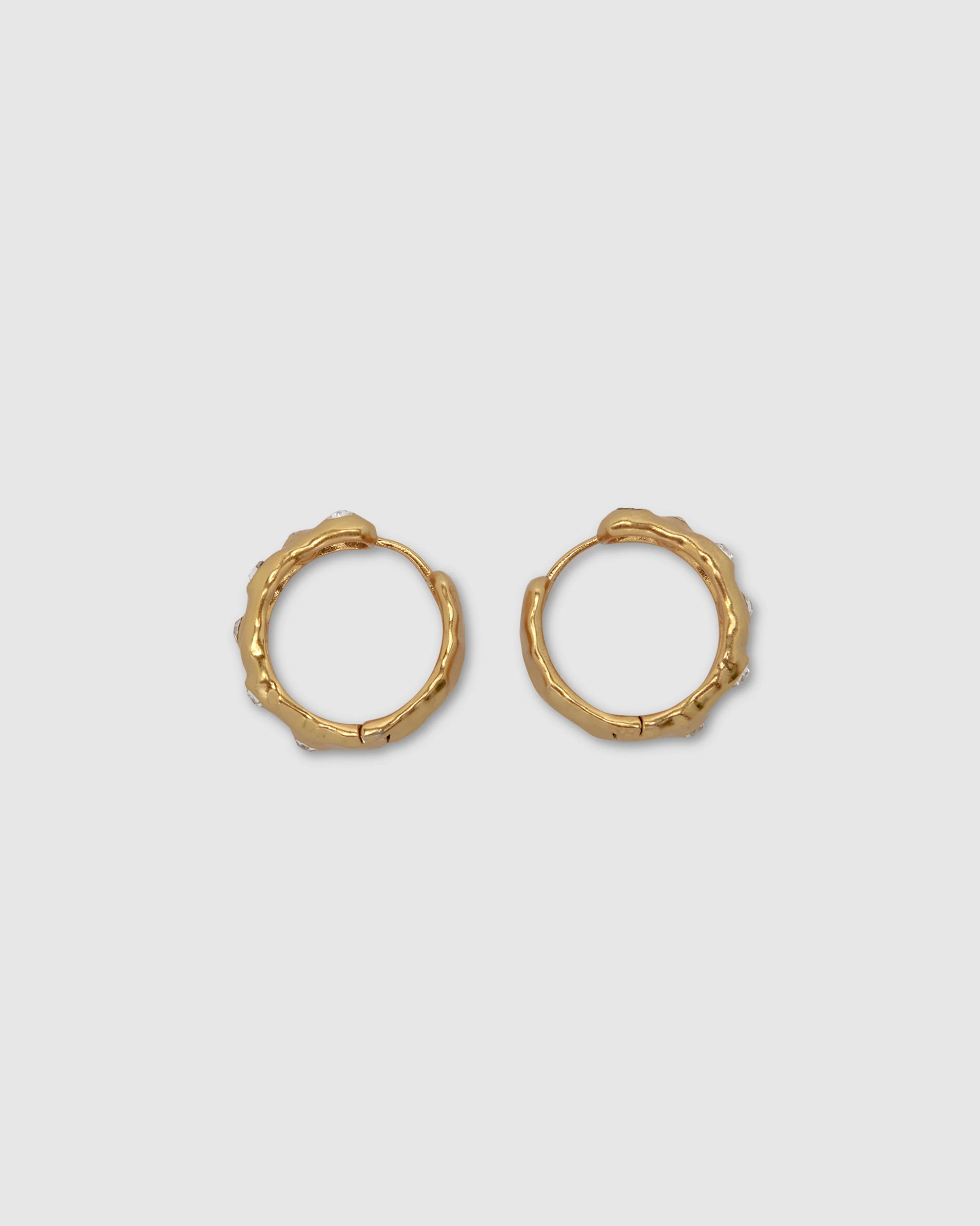 A refined nod to the polka-dot, these organic hoop earrings are crafted from a solid brass base and finished in 24k gold plating. Intentionally placed white cubic zirconia stones resembling delicate dots of light, creating a soft sparkle that moves effortlessly with you. Sculptural and timeless, they’re designed for everyday wear and lasting appeal.