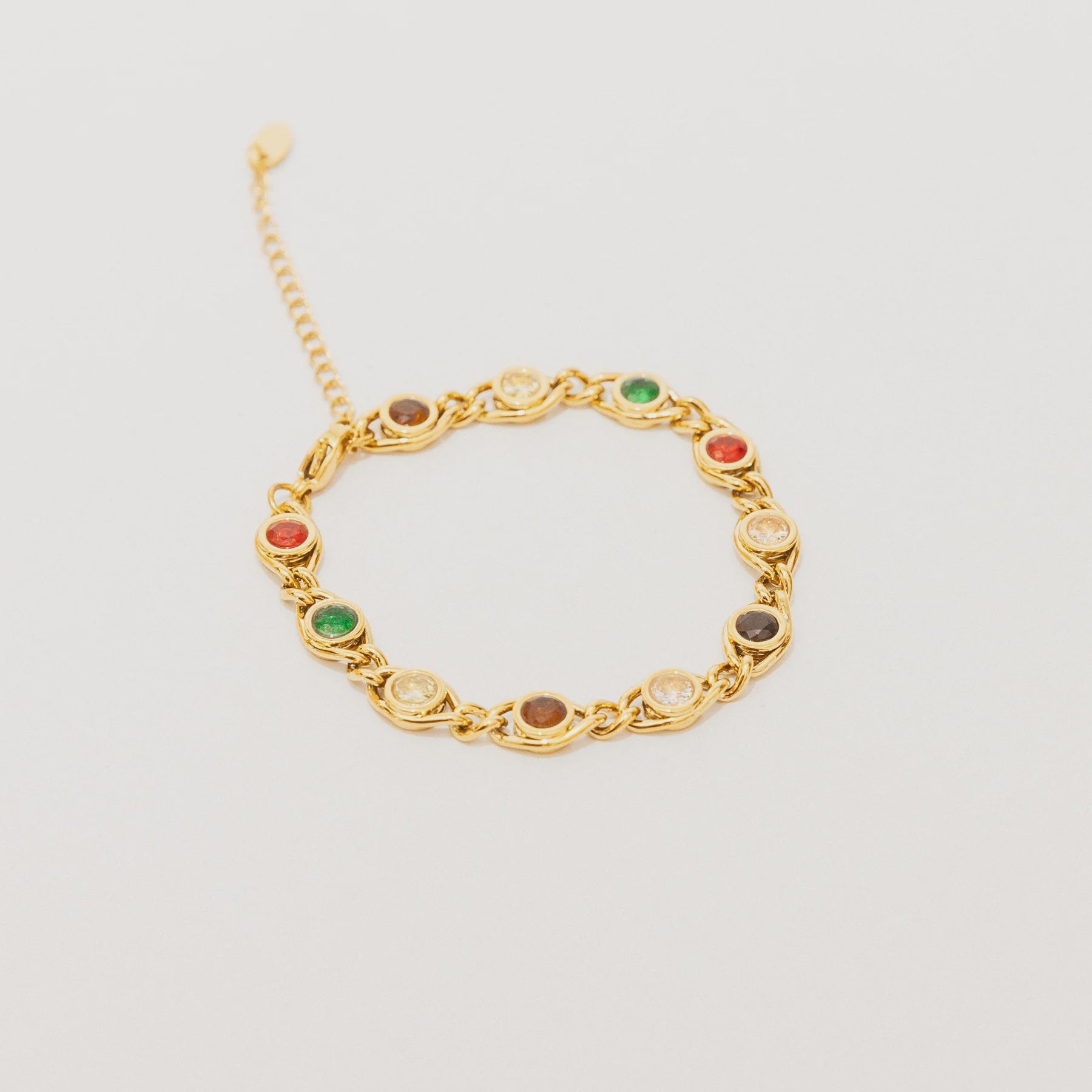 Elegance and class define the Stella Bracelet. This exquisite piece features a stunning gold chain adorned with shimmering multi-colored stones, capturing the essence of luxury. It’s the perfect accessory to elevate your style and mix and match with the Stella Necklace.