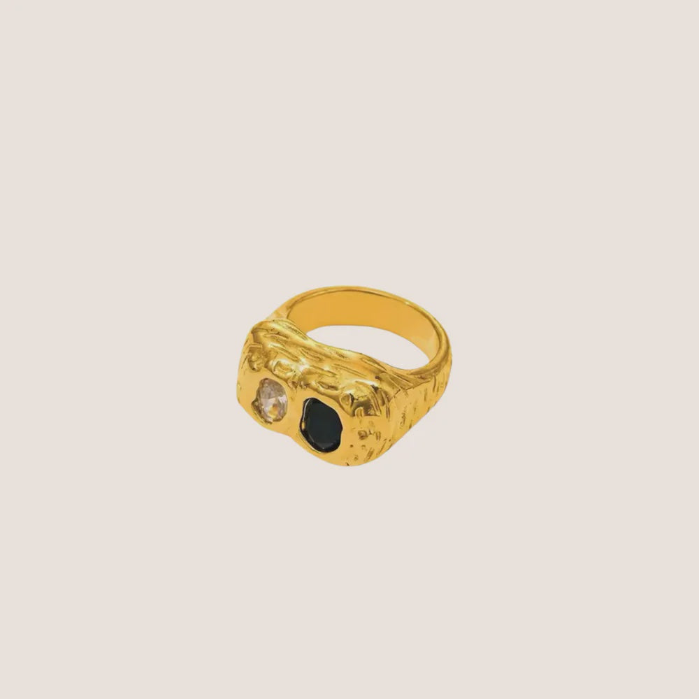 Make a bold statement with the Vortex Ring. Made from chunky dented 18k gold-plating, this rectangular-shaped band brings an edgy, fashion-forward vibe. Two oversized zirconias—one black and one crystal clear—sit side by side on top in a sleek square setting, adding a sharp contrast to the textured finish of the band. Designed to be worn on your pointer finger, this ring is all about attitude, effortlessly combining cool, contemporary style with a striking, statement-making presence."