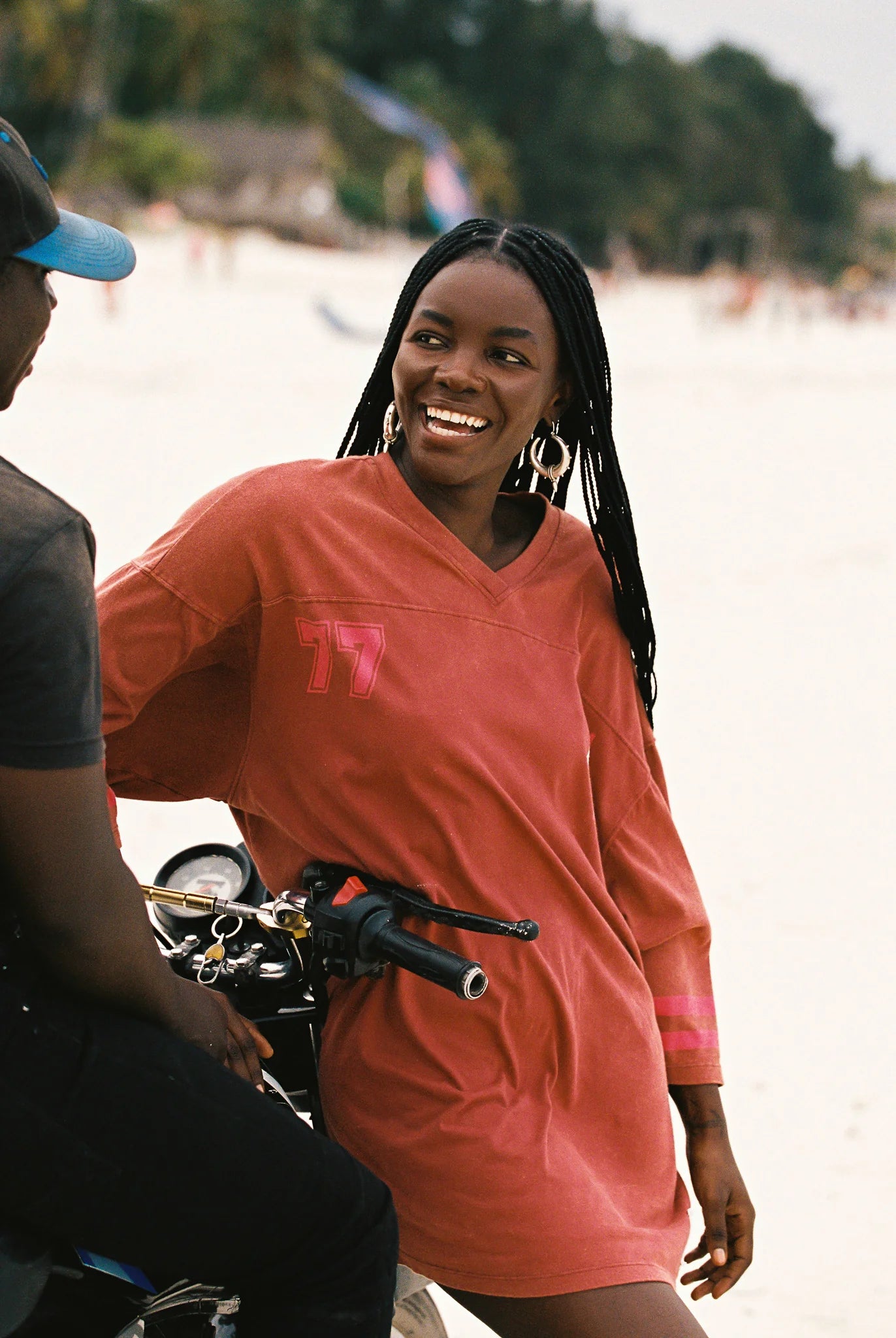 The Team KC Tee Dress is retro athletic inspired. Crafted in soft, washed cotton for a lived-in feel, this oversized tee dress features a relaxed v-neckline, drop shoulders and wide sleeves with sporty stripe detailing. Designed for comfort and versatility, the Team KC Tee Dress can be worn solo, layered over bike shorts or as a beach cover-up.