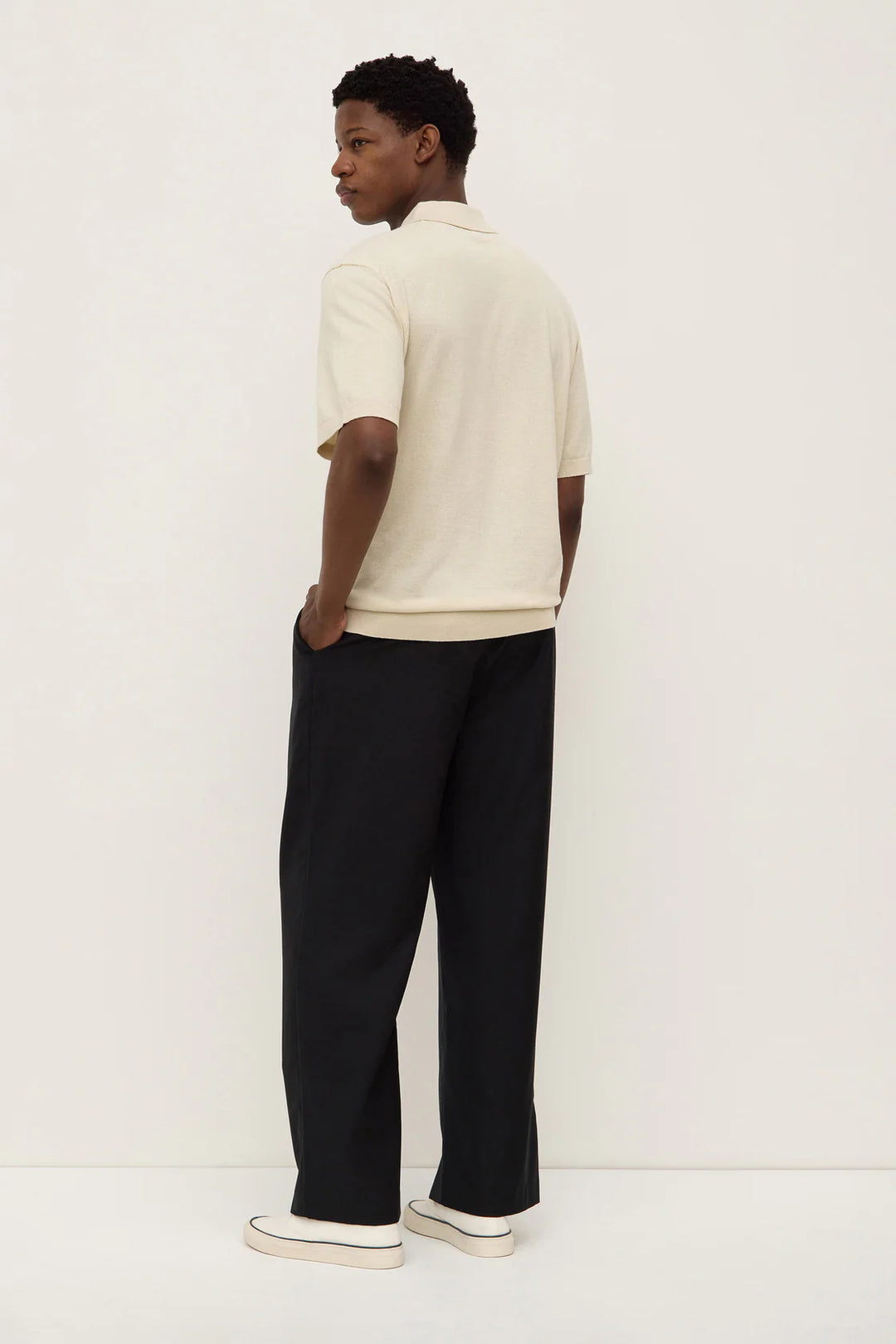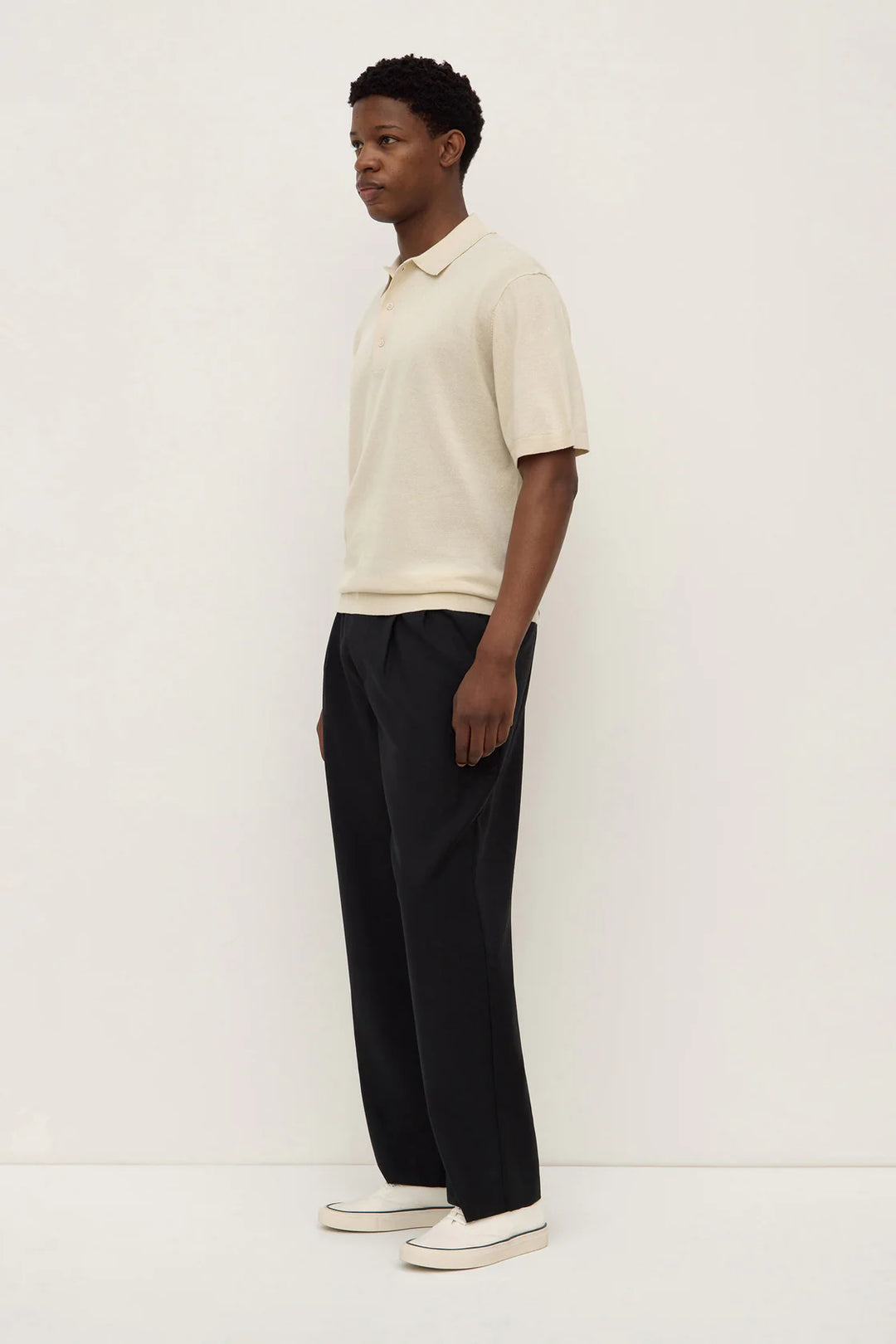 The Henry Knit Polo in limestone is a 100% organic cotton lightweight knit with a collared neckline and button placket, offering a relaxed fit.