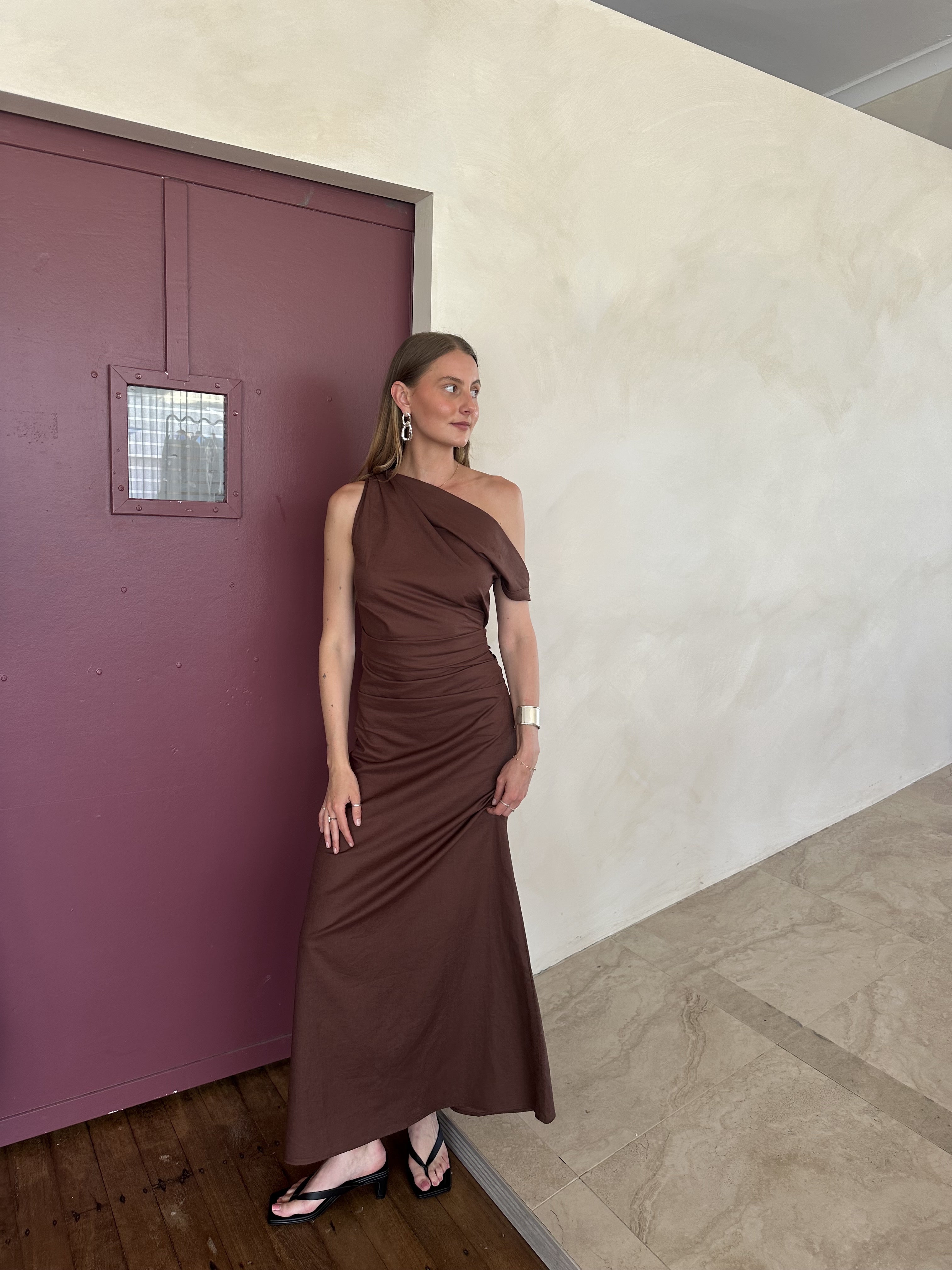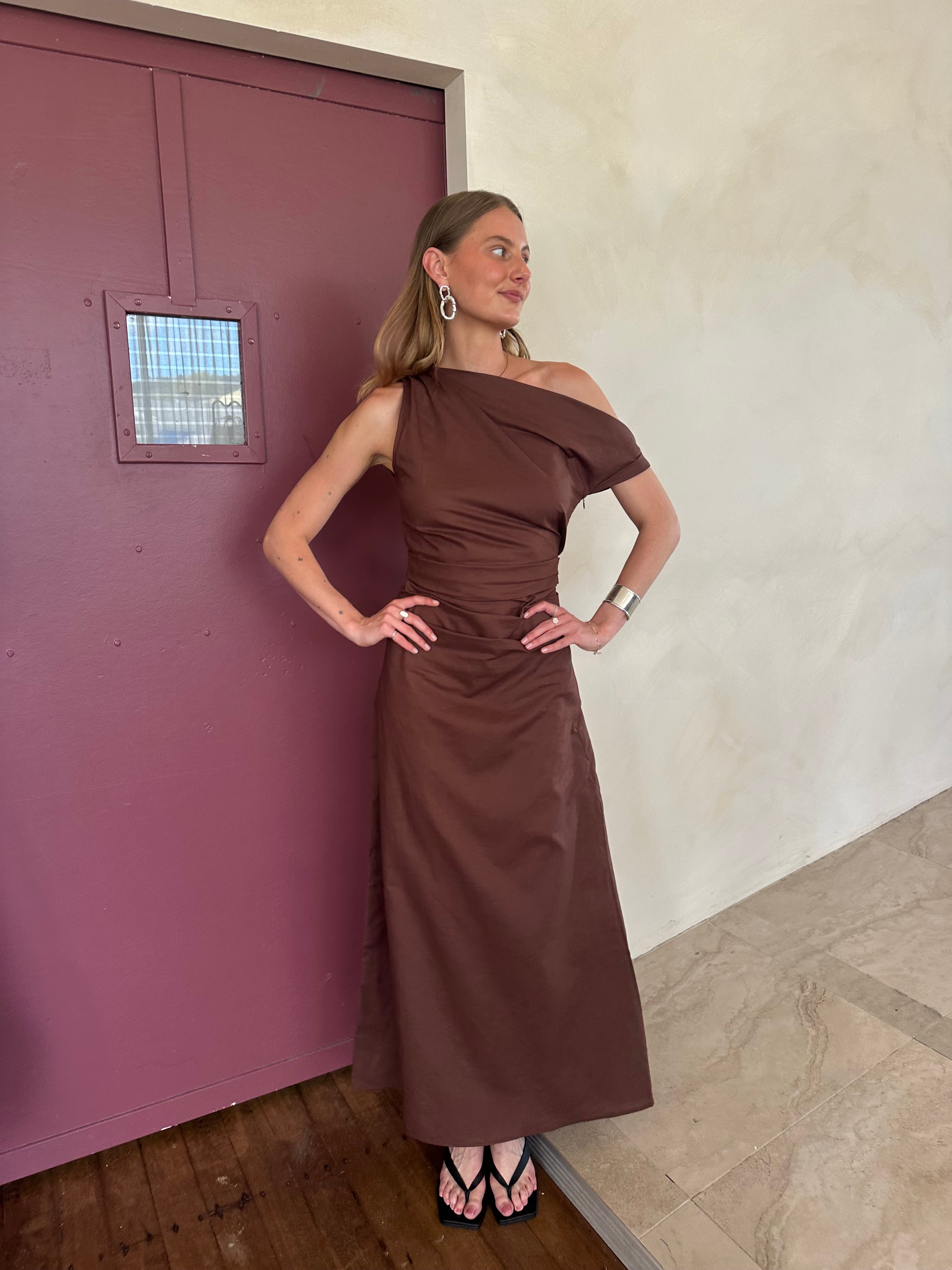 Maxi Dress Brown Asymmetrical Neck Line