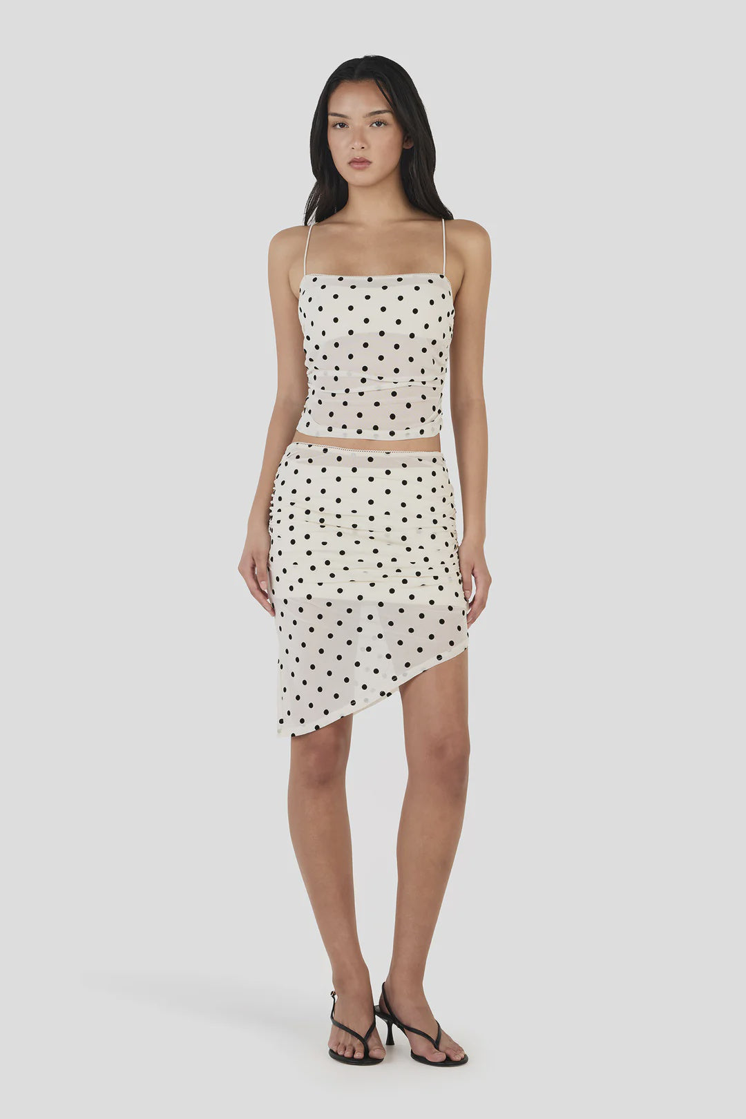 The Talia Midi Skirt is a sheer mesh midi slip skirt designed with ruched side seams forshaping and an asymmetrical hemline. The skirt is half lined for coverage leaving the rest of the skirt sheer. Pair with the matching Asena Cami for a complete set to mix and match.