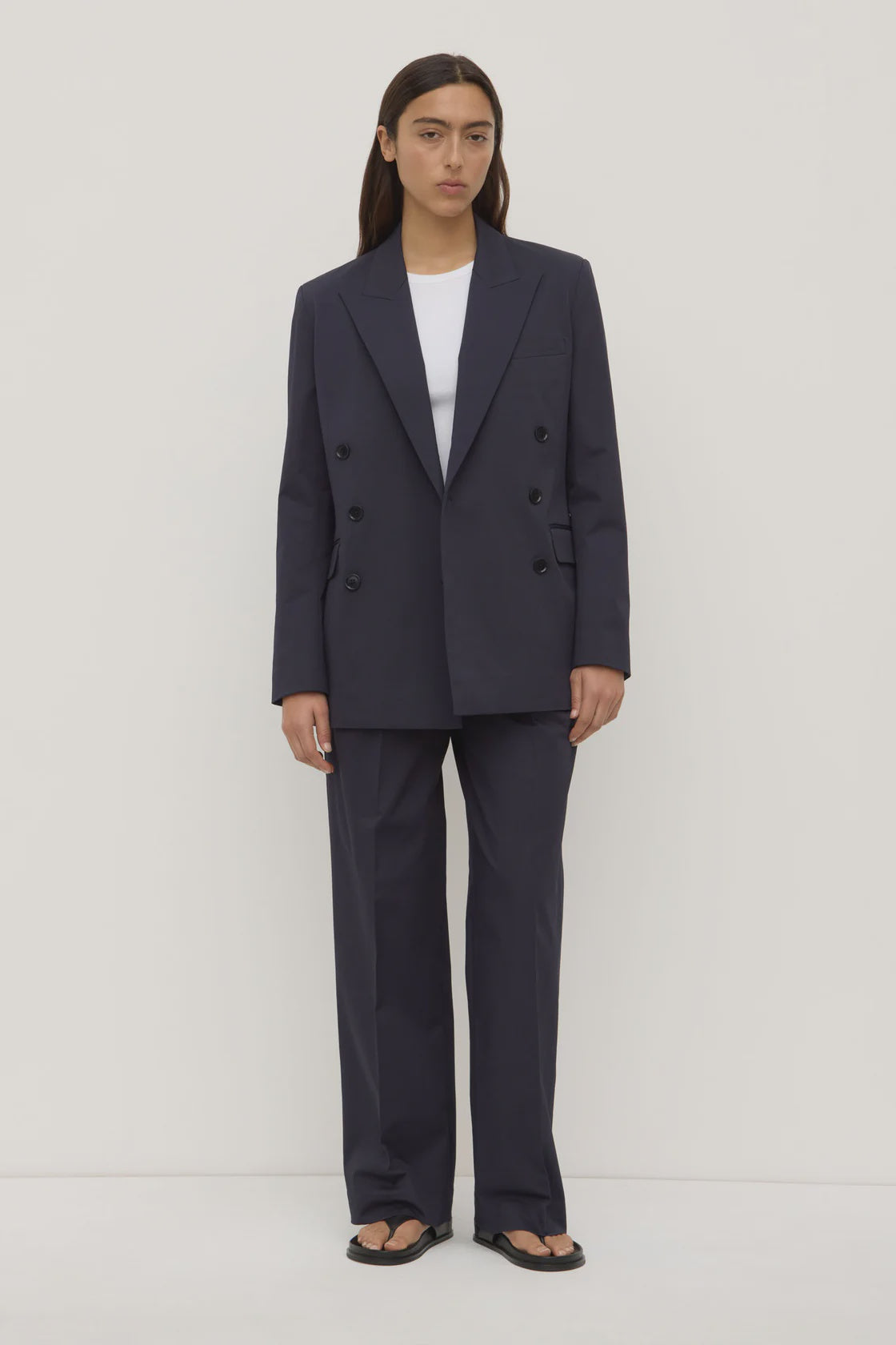 Crafted from a textured cotton twill, this blazer offers a tailored fit and is designed to pair with the matching Ellen Cotton Twill Pant. Features a double breasted front, peak lapel and a single back vent detail.
