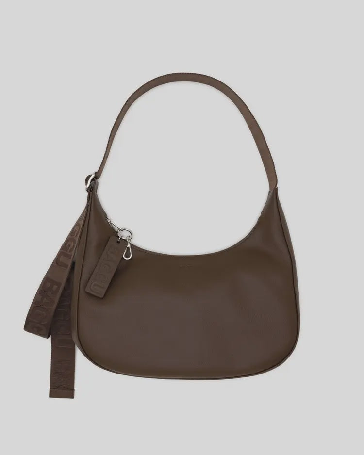 Our medium crescent shape in recycled leather. Elevated, durable, and roomy. With an interior zip pocket and thoughtful additions like a key leash and debossed keychain.