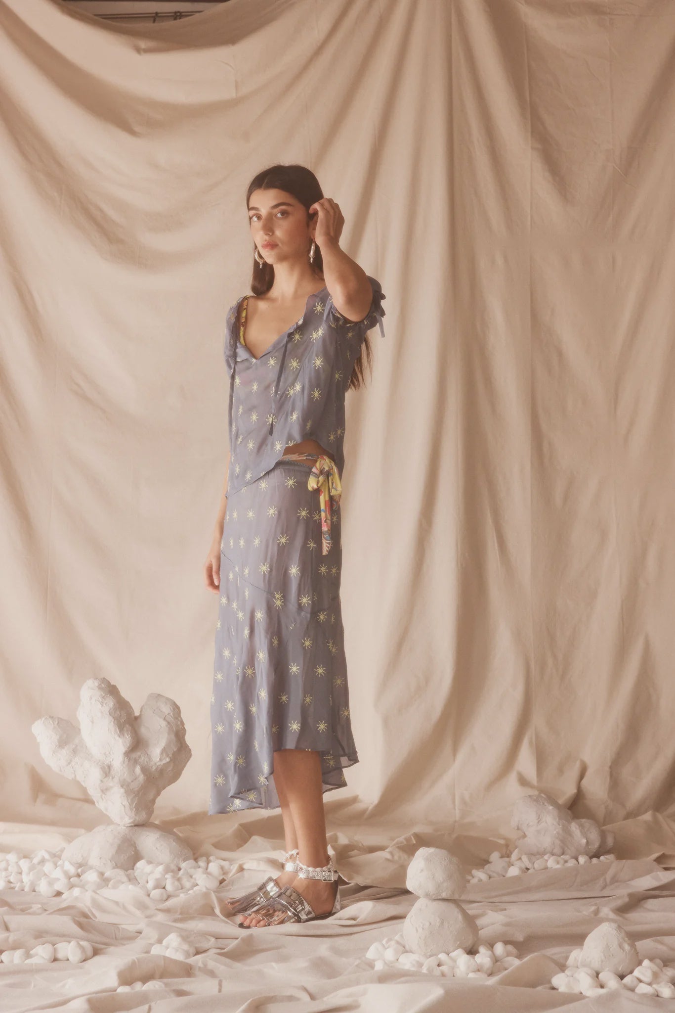 The Solstice Luce Skirt is a fluid, feminine piece designed to capture light and movement. Cut from a sheer, airy fabric adorned with delicate sunburst embroidery, this bohemian midi skirt brings an ethereal charm to summer dressing. Its flowing silhouette, soft drape and asymmetrical hemline make it equally at home styled for resort evenings, coastal getaways or festival days.