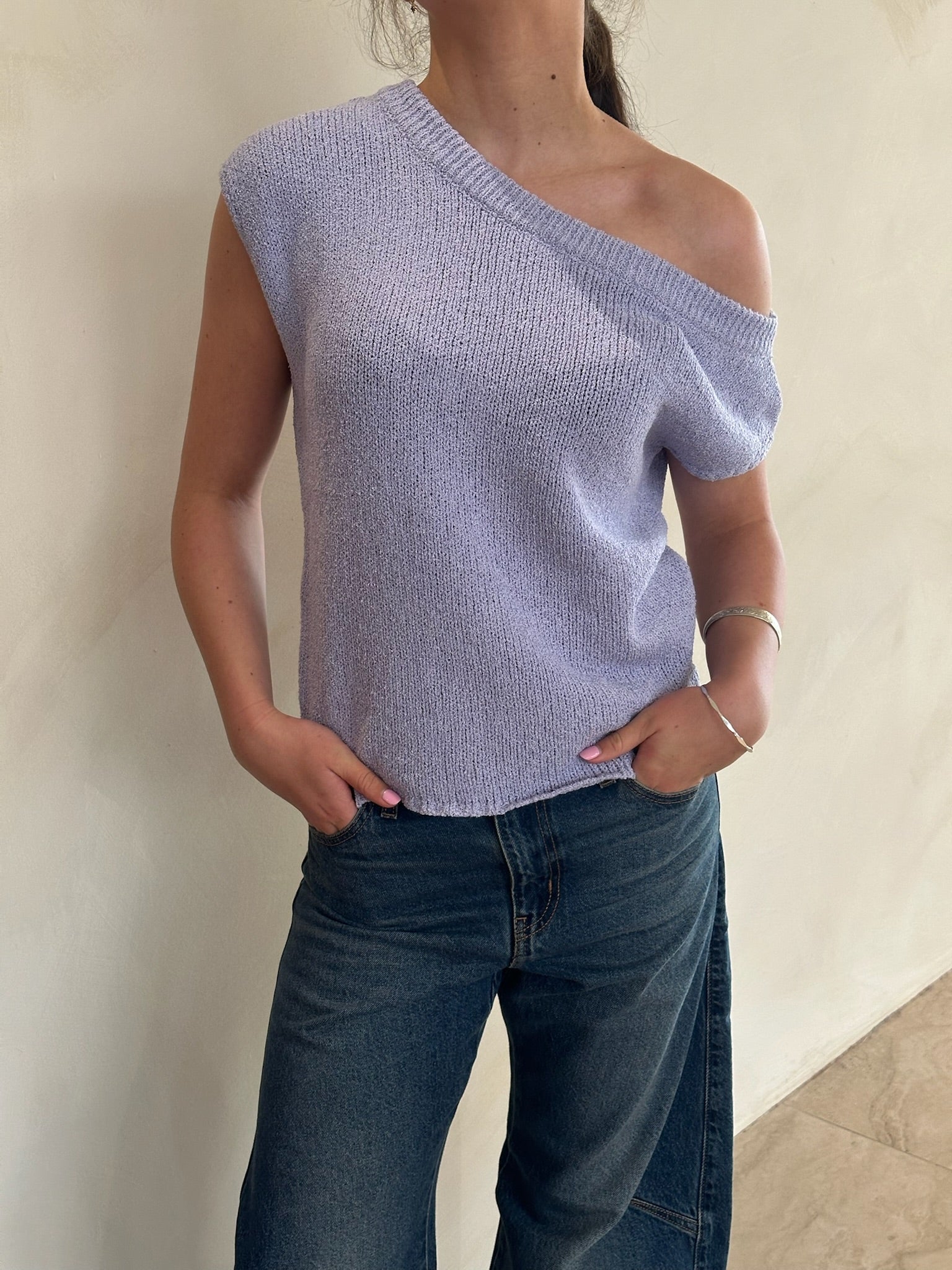Features an asymetric neckline, boxy fit, 70% acrylic & 30% Polyester