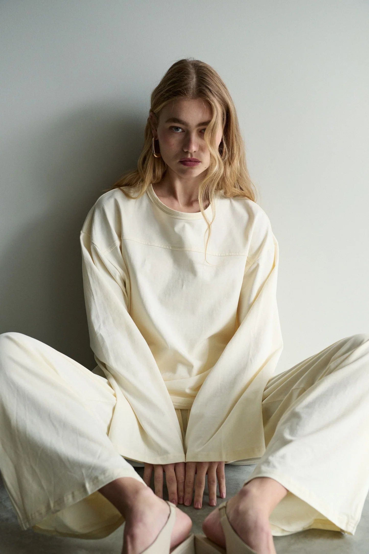 The wide sleeves and dropped shoulder seams add a modern, slouchy edge, while the clean crew neckline keeps it classic. Perfect for layering or wearing solo, this oversized tee pairs effortlessly with the Isola Pant. It's the perfect weekend uniform.